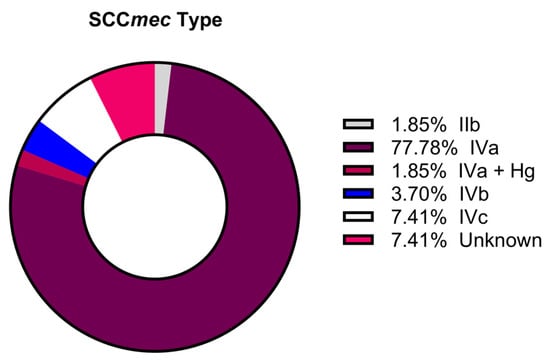 As an additional feature relevant for characterizing the MRSA isolates, we examined the distribution of SCCmec (Figure 4), which demonstrated SCCmec type IVa to be dominant (77.8%). Four MRSA isolates were untypeable and may belong to an unknown type or those outside the tested type I–V distribution.