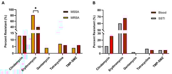 S. aureus antibiotic resistance. Antibiogram data for (A) MRSA vs. MSSA, (B) infection type. * p < 0.01. The following resistances are not depicted: rifampin (0%), vancomycin (0%), penicillin (99.2%), oxacillin (0% for MSSA, 100% for MRSA).
