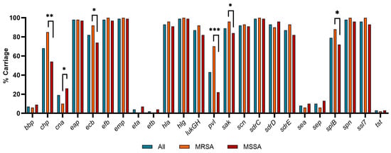 VF gene carriage based on methicillin resistance/sensitivity. For all isolates, MRSA, n = 52 (+2 for genes listed in Table 2) and MSSA groups (n = 68). *** p < 0.0001; ** p < 0.001, * p < 0.05.