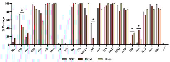 Four VFs varied significantly with infection type: chp, pvl, sea, and sep (Figure 7 and Table 6). SSTI isolates were found to carry chp and splB more frequently, but were less likely to carry sea. Only sep was found most frequently in blood isolates, which supports a study by Calderwood, et al., demonstrating a significant link between sep carriage and the development of bacteremia [88]. Interestingly, the carriage of chp and sea was similar between blood and urine isolates, suggesting that their carriage may support invasive infections.