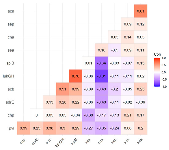 Using Pearson’s correlation, two pairs of genes showed a strong relationship and are associated with lukGH. A strong positive correlation was found between lukGH and splB (0.76), whilst a strong negative correlation was found between lukGH and cna (−0.81), as shown in Figure 9. All other correlations were moderate to low.