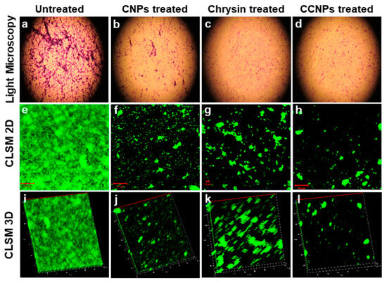 Microscopic examination of biofilm: Light microscopy images of S. aureus biofilm (a) untreated, and treated with (b) CNPs, (c) chrysin and (d) CCNPs, showing dispersion in biofilm formation. CLSM 2D images (e–h) and 3D images (i–l) showing bacterial biofilm untreated, and treated with CNPs, chrysin and CCNPs, respectively.
