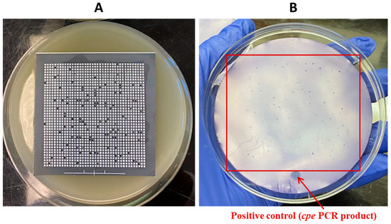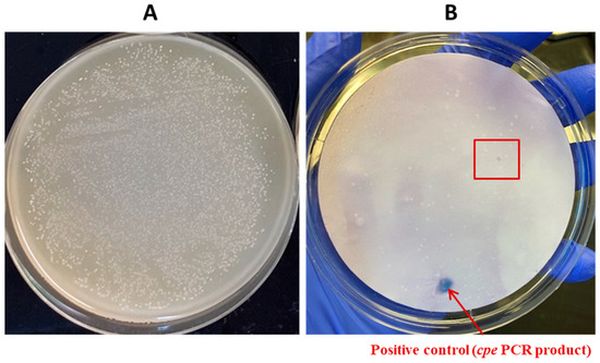 Application of the DP-CH method using samples of broiler chicken carcass rinsates artificially contaminated with C. perfringens AHL 311 (tube 6, Table 2). (A) Bacterial growth on a TSC agar plate obtained from the analysis of tube 6. (B) Positive hybridization signals from colonies printed from the corresponding TSC agar plate (see in (A)) and from the positive control (cpe PCR product) (tube 6, Table 2). Red square is showing colonies demonstrating a positive hybridization signal.