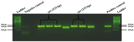 Fragments of 333 bp from the cpe gene were PCR amplified as described by Heikinheimo et al. with slight modifications [25]. DNA extracted from the enterotoxigenic C. perfringens AHL 311 control strain was used. After amplification, the DNA was quantified by DENOVIX following the manufacturer’s instructions (DeNovix and Qubit dsDNA Assay, Biolabtech LTD, Kyiv, Ukraine) and labeled using the DIG High Prime DNA Labeling and Detection Starter kit I from Roche Diagnostics. The labeled PCR product obtained was visualized on a 1% agarose gel containing 0.01% SYBR Safe DNA gel stain as advised by the manufacturer (Invitrogen, Burlington, ON, Canada). The synthesized DNA probe was preserved at −20 °C until use to detect the cpe gene during the steps described below.