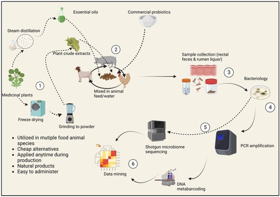 The selection of “traditional” food safety interventions before slaughter incorporates emerging food safety issues, including antibiotic replacement, genome sequencing of microbiomes and cost–benefit analysis. (1) Preparation of plant-derived supplements. Extraction involves a steam distillation process in the case of essential oils or grinding into powder for crude extracts. (2) Supplements may be mixed in feed or drinking water for easy administration. (3) Fecal and ruminal sample collection. (4) Morphological identification of bacteria, (5) Molecular identification of bacteria and genome sequencing of marker genes. (6) Microbiome data analysis.