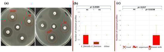 The only strain that showed multidrug phenotypic resistance profile to three antibiotics (AMP-HLSR-RP) was E. faecalis BM15 isolated from human breast milk (1.38% from all tested strains). Phenotypic resistance to two antibiotics was observed for strains E. faecium CM1 (AMP-ERV), E. faecalis YFC1 (AMP-TG), and E. faecalis BM7 (HLGR-RP). However, the statistical analysis showed that there is no significant difference in the number of resistance profiles between E. faecalis and E. faecium (p = 0.674); E. faecalis and other Enterococcus species (p = 0.0589); and E. faecium and other Enterococcus species (p = 0.471) (Figure 5b). The human isolates (breast milk) exhibited patterns of resistance to more antibiotics compared to the other two groups (food and snail isolates). A significant difference between antibiotic resistance phenotype profiles was established between strains from food and breast milk (p = 0.017), as well as strains from snail and breast milk (p = 0.0238), but not between isolates from snail and food (p = 0.855) (Figure 5c).
