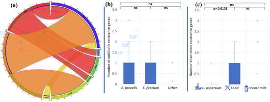 (a) Distribution of antibiotic resistance genes in enterococci from food, snail, and breast milk (labeled BM in the circus plot) (the image was generated with Circos Table Viewer v0.63-10). The outer ring of the circus plot represents the number of isolates that carry the analyzed genes. Connecting lines between the specific genes and the origin of the isolates are shown if the gene was detected in isolates from any of the three origins. Comparison of the number of antibiotic resistance genes between the different enterococcal species (b) and the different strains’ origins (c). Significant difference is considered p < 0.05.