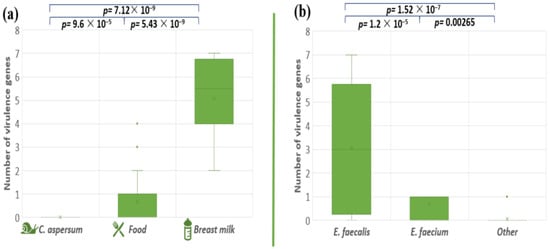 The pathogenicity degree of the pathogenic microorganisms depends on genetically determined virulence factors. The presence of a total of eight virulence genes (cylB, esp, gls24, nucl, psaA, agg, gelE, and ace) among our enterococcal isolates was investigated (Table 4). The analyses of the distribution of the tested virulence-associated genes showed that the snail isolates did not possess any of the analyzed virulence genes. Stress protein regulator (gls24-like) was not found in the investigated enterococcal isolates. The most amplified gene among all the isolates was the gelatinase gene (gelE), followed by the Mn-transporter psaA: 31% and 28%, respectively. Both genes responsible for the synthesis of enterococcal surface protein (esp) and nuclease (nucl) were presented in 19.4% of all tested strains. Genes responsible for hemolytic activity (cylB) and collagen-binding protein (ace) were detected in 18% of the enterococcal population. Genetic determinants for aggregation substance (Agg) were found in 15.2% of the tested isolates. Four human breast milk isolates (BM5, BM6, BM9, and BM10) contain seven out of the eight screened virulence genes. The distribution of all tested virulence factors among food isolates were strain specific. The comparison of the distribution of the virulence factors in enterococcal strains isolated from the different ecological niches, showed significant differences (between snail and food isolates p = 9.6 × 10−5; food and breast milk p = 5.43 × 10−9; snail and breast milk p = 7.12 × 10−9) (Figure 7a). A similar tendency was observed between E. faecalis and E. faecium p = 1.2 × 10−5; E. faecium and other Enterococcus species p = 0.00265; E. faecalis and other Enterococcus species p = 1.52 × 10−7 (Figure 7b).