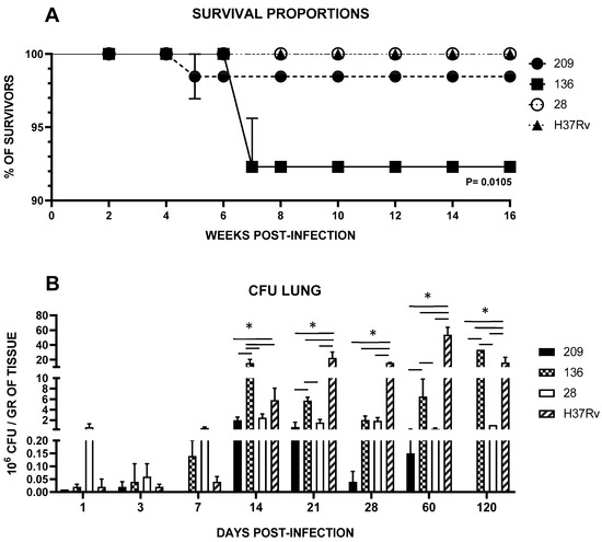 (A) Survival Kaplan–Meier plot; (B) Lung bacillary load survival curves were constructed with 20 infected mice per bacterial strain and analyzed with Kaplan–Meier plots and the Log Rank test (Mantel-Cox). Data are the mean ± SD of measurements from three mice per time point in three different experiments. Asterisks represent statistical significance (p < 0.05) when compared with H37Rv strain infection.
