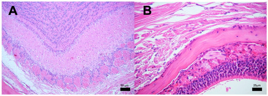 Tissues were dehydrated and paraffin-embedded using a Histokinett, following a 12 h cycle, with increasing concentrations of alcohols, xylenes, and paraffin. Formalin-fixed tissues were embedded in paraffin, sectioned at 2 μm thickness, and stained with either hematoxylin and eosin (H&E) or Ziehl–Neelsen (ZN) stain. Whole heads were decalcified in ethylenediaminetetraacetic acid (EDTA) 0.5 M pH 8 for 3 weeks at 5 °C, after formalin fixation. The tissues underwent processing using the conventional histological technique for hematoxylin and eosin (H&E) staining. Subsequently, the histological sections were examined under a bright-field binocular microscope.