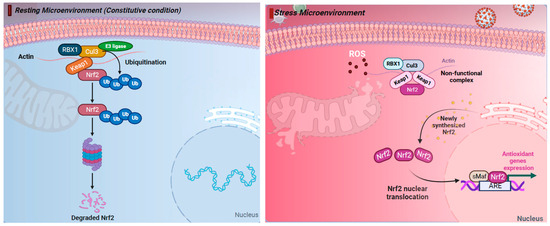 The nuclear factor erythroid 2-related factor 2 (NRF2) pathway regulates cellular responses to stress. (Left) Under resting (constitutive) condition, in the cytoplasm NRF2 is anchored with Kelch-like ECH-associated protein 1 (KEAP1). NRF2 binds KEAP1 and becomes ubiquinated, leading to degradation by the 26S proteasome. (Right) Under oxidative stress response, NRF2 escapes repression by KEAP1. The CUL3/KEAP1 complex that targets NRF2 for ubiquitination undergoes a change to a nonfunctional conformation. Thus, newly synthesized NRF2 is no longer ubiquitinated/degraded, rapidly accumulates, and translocates to the nucleus where it binds the small maf protein (sMaf) and antioxidant response element (ARE). Activation of ARE increases the expression of the antioxidant genes heme oxygenase 1 (HO-1), quinone oxidoreductase (NQO1), and glutathione (GSH), which blocks the progression of oxidative stress (OS). Thus, activation of the NRF2 pathway has cytoprotective effects and plays a key role in maintaining redox balance. Figure generated with Biorender (https://biorender.com/, accessed on 10 November 2023).
