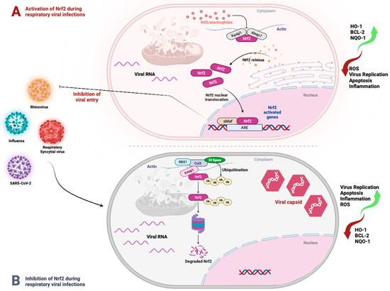 Bidirectional crosstalk between replication of respiratory viruses and NRF2. Depending on the phase of the infection (early versus late), the type of respiratory virus and the context of the redox responses, respiratory viruses can either activate (A) or inhibit (B) the NRF2 pathway and associated downstream genes such as HO-1, NQO1, and BCL2, which regulate ROS, inflammation, apoptosis, viral entry, and replication. Figure generated with Biorender (https://biorender.com/, accessed on 10 November 2023).