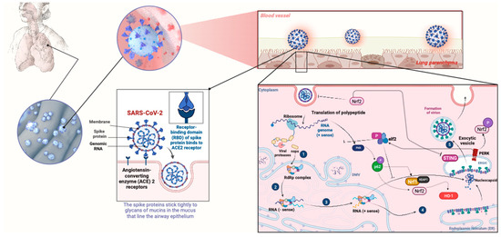 Crosstalk of SARS-CoV2 with the NRF2 pathway. The viral spike (S) protein binds to the receptor angiotensin-converting enzyme 2 (ACE2), leading to virion entry. The viral nucleocapsid is uncoated in the cytoplasm of the host cell and the viral positive-sense single-stranded RNA (+ssRNA) is translated and then cleaved into specific viral proteins. Autoproteolysis and co-translational cleavage of polypeptide to generate nsps is shown as (1)). (- Sense) subgenomic transcription and RNA replication is shown as (2). (+ Sense) subgenomic transcription and RNA replication is shown as (3). Translation of subgenomic mRNA into structural and accessory proteins is shown as (4). Viral RNA inside the host cell activates the DNA/RNA sensor cGAS, which signals through the adaptor STING. Host defense is conducted by double-stranded RNA-activated protein kinase R (PKR), which phosphorylates eIF2 and inhibits protein translation. PKR also phosphorylates p62, thus activating NRF2 upon removal of its repressor KEAP1 through autophagy. Inhibition of protein translation in turn activates the unfolded protein response (UPR). PERK, a crucial Ser/Thr protein kinase in UPR signaling, phosphorylates NRF2, resulting in its stabilization and increased transcriptional activity. Activation of the NRF2 pathway (i) represses IFN production by downregulating STING expression; and (ii) induces the expression of HO-1, generating Fe2+ that can bind to the divalent metal-binding pocket of the RNA-dependent RNA polymerase (RdRp) of SARS-CoV2 and inhibit its catalytic activity. Thus, the NRF2 pathway is involved in multiple pathways involved in SARS-CoV-2 pathogenesis. Abbreviations: ACE2, angiotensin-converting enzyme 2; eIF2, eukaryotic initiation factor 2; ER, endoplasmic reticulum; ERGIC, ER–Golgi intermediate compartment; HO-1, heme oxygenase 1; IFN, interferon; KEAP1, Kelch-like ECH-associated protein 1; NRF2, nuclear factor erythroid 2 p45-related factor 2; PERK, PKR-like endoplasmic reticulum kinase; P, phosphorylation; PKR, protein kinase R; STING, stimulator of interferon genes. Figure generated with Biorender (https://biorender.com/, accessed on 10 November 2023).
