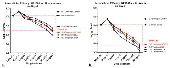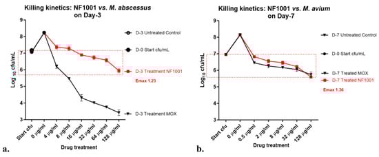 NF1001-Killing kinetics at various drug concentrations against Mabs and Mav: Symbols (residual log10 cfu/mL) are uniform across the graphs of respective cultures (Mabs, Mav) in 7H9 + 10% ADC: Filled circles = Day-0 start cfu- control culture unexposed to drug, Open circles = end-point control culture unexposed to drug (Day-3 for Mabs and D-7 for Mav), filled square in red = exposure to NF1001, filled inverted triangles = exposure to MOX. Data represent the mean ± SD of three biological replicates. Emax (log10 cfu reduction/mL at maximum concentration tested) upon NF1001 exposure vs. D-0 control culture: (a) Mabs ATCC 19977 (30 °C, for 3 days) Emax128 = 1.2, and (b) Mav ATCC 19698 (30 °C, for 7 days) Emax128 = 1.36. The red dotted box shows the quantum of maximum cfu reduction for the respective drugs.