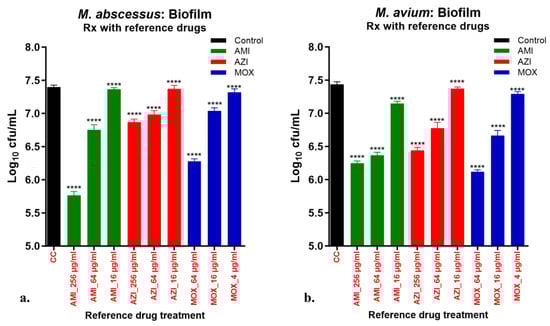 Treatment of preformed biofilm inhibition and cfu reduction using reference drug treatment: Biofilms of Mabs (a) and Mav (b) in 96-well format were tested in triplicate (biological replicates) for inhibition and cfu reduction using AMI, AZI, and MOX at three doses (256, 64 and 16 µg/mL for all the drugs; except for MOX against Mabs which were 64, 16 and 4 µg/mL) at 37 °C, along with an untreated control. The graphs represent residual log10 cfu/mL of Mabs (a) or Mav (b), respectively. (MIC is the first concentration showing growth inhibition or cfu reduction >0.2 log10 in the drug treated samples vs. the growth control.) Growth control = black bars, AMI = green bars, AZI = red bars, and MOX = blue bars. Error bars indicate ± SD of biological triplicates. Statistical significance was evaluated by one-way ANOVA (Dunnett’s test) compared to the untreated (bacteria only) control (**** p < 0.0001).