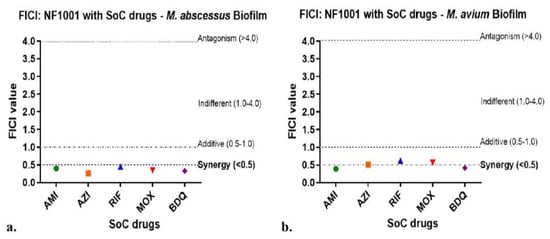 NF1001 demonstrated synergism or it was additive with all the SoC drugs tested against the biofilms of both NTM species, Mabs and Mav. NF1001 did not show antagonism with any of the SoC drugs against these NTM (FICI < 4.0). No antagonism was observed (FICI < 4.0) with any of the five SoC drugs tested (Figure 8a,b). None of the combinations had FICI > 1.0, suggesting that NF1001 has a great treatment potential in combination. The data used to calculate the FICI are in the Supplementary Figures S2 and S3.
