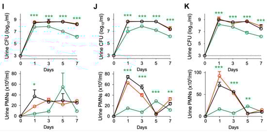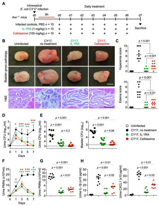 Acute cystitis was established in susceptible Asc−/− mice by infection with the clinical acute cystitis isolate E. coli CY17, and the mice were sacrificed on day 7 (schematic in Figure 1A). Infected mice developed severe acute cystitis, characterized by edema, hyperemia, and a loss of tissue structure (Figure 1B,C). Urine cultures remained positive until sacrifice with no evidence of bacterial clearance (Figure 1D,E). A dramatic increase in urine neutrophil numbers was detected after 24 h, and neutrophil counts remained high until sacrifice (Figure 1F,G). Urine IL-1β and CXCL1 levels were elevated compared to uninfected mice (Figure 1H).