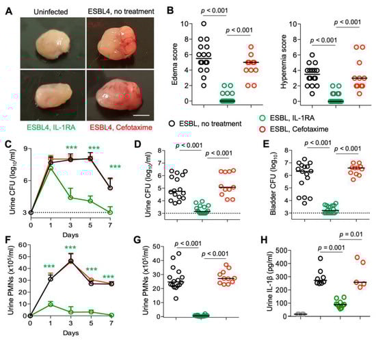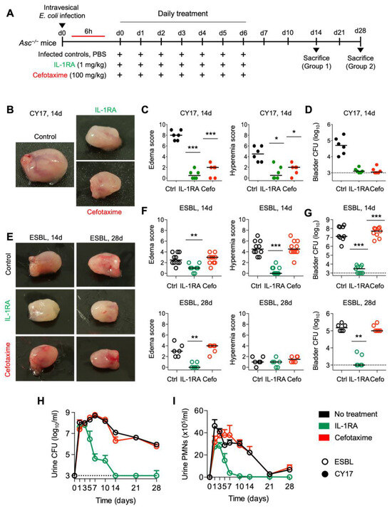 To determine if the therapeutic efficacy of IL-1RA extends to antibiotic-resistant strains, Asc−/− mice were infected with ESBL-producing E. coli isolates using the protocol described above (Figure 2). Infection caused acute cystitis, according to the criteria described above. IL-1RA treatment was shown to reduce gross pathology scores and accelerate bacterial clearance from day 3 (Figure 2A–E). Urine neutrophil numbers were reduced by 50–70% after 24 h and remained low until sacrifice, confirming the therapeutic efficacy of IL-1RA treatment (Figure 2F,G). Urine IL-1β levels were strongly reduced (Figure 1H). Cefotaxime treatment had no effect on these endpoints compared to the sham-treated group (Figure 2A–H).