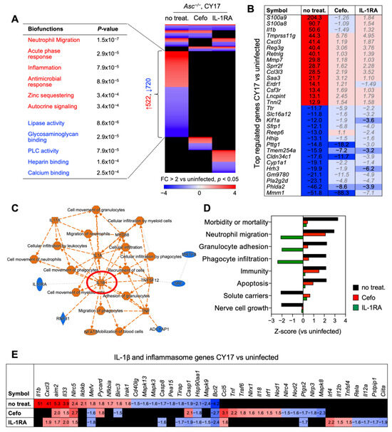 IL-1RA treatment inhibits the expression of pro-inflammatory genes in infected Asc−/− mice. Whole bladder mRNA was subjected to transcriptomic analysis. (A) Gene expression profiles were compared between CY17-infected, untreated controls, and IL-1RA- or cefotaxime-treated mice (n = 2 mice per treatment group, n = 1 for uninfected control). Heat map of regulated genes in the treatment groups and CY17-infected controls compared to uninfected controls (cut-off FC ≥ 2, p < 0.05). Biofunctions of genes specific to CY17-infected controls included neutrophil migration, acute phase responses, inflammation, and antimicrobial responses. These responses were not activated in cefotaxime- or IL-1RA-treated mice (red = activated, blue = inhibited, black = not significantly regulated, compared to uninfected controls). (B) Top-regulated genes in CY17-infected mice treated with cefotaxime or IL-1RA compared to untreated controls. (C) IL-1 and MyD88-centric gene network in CY17-infected mice compared to uninfected controls (orange = activated function, blue = inhibited function). (D) Top-regulated biofunctions defined by Ingenuity Pathway Analysis (IPA) in CY17-infected untreated mice, compared to cefotaxime- or IL-1RA-treated mice (cut-off Z-score > ±1.5, p-value < 0.05). (E) Top-regulated IL-1β and inflammasome-regulated genes in CY17-infected mice. Activation of IL-1β and inflammasome-related genes in CY17-infected untreated mice and inhibition in IL-1RA- and cefotaxime-treated mice.