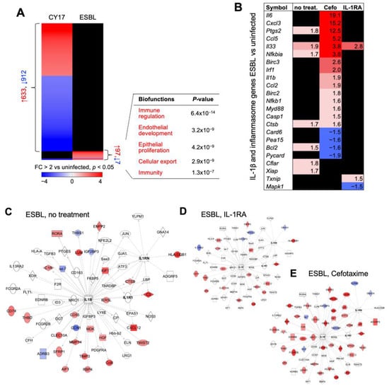 IL-1RA treatment inhibits and cefotaxime treatment activates the expression of pro-inflammatory genes in infected Asc−/− mice. (A) Gene expression profiles were compared between CY17-infected and ESBL4-infected mice and uninfected controls (n = 2 mice per treatment group, n = 1 for uninfected control, cut-off FC ≥ 2, p < 0.05). A subset of ESBL-specific genes was identified and biofunctions were related to immune regulation, endothelial development, epithelial proliferation, and cellular export. (B) Heat map of IL-1β and inflammasome-regulated genes in the ESBL-infected treatment groups compared to uninfected controls (n = 2 mice per treatment group, n = 1 for uninfected control). (C–E) Limited effects of ESBL on gene expression, shown by an IL-1β and IL-RA-specific gene network (cut-off FC ≥ 2, p < 0.05). Gene networks from IL-RA or cefotaxime-treated mice are shown.