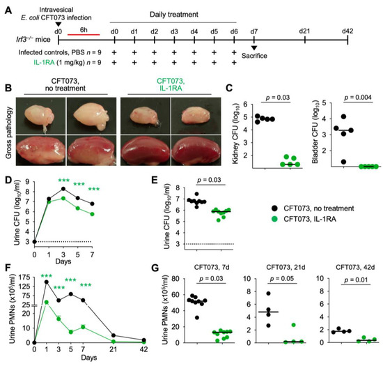 Efficacy of IL-1RA treatment in Irf3−/− mice with acute pyelonephritis. (A) Schematic of the infection and treatment protocol. Genetically predisposed Irf3−/− mice were infected with the uropathogenic strain E. coli CFT073 (antibiotic sensitive) at 108 CFU. Six hours post-infection, mice were treated I.P. with IL-1RA (anakinra, 1 mg/kg). Treatment was continued daily, until day 7, when mice were sacrificed. Another group was followed for 21- and 42-days post-infection (n = 9 mice per group). (B) Therapeutic efficacy of IL-1RA defined by a loss of gross pathology, hyperemia, and edema. Treatment alleviated acute pyelonephritis in infected mouse kidneys. (C–G) Treatment accelerated bacterial clearance and reduced inflammation, quantified as neutrophil recruitment. (C) Bacterial counts in kidney and bladder tissue (day 7). (D) Kinetics of infection. Mean log10 CFU/mL urine is shown for days 1, 3, 5, and 7 post-infection. (E) Bacterial counts in urine (day 7). (F) Kinetics of neutrophil recruitment. Mean neutrophil numbers in urine are shown for days 1, 3, 5, 7, 21, and 42 post-infection. (G) Quantification of neutrophils in urine (days 7, 21, and 42). Representative bladder images (B). Data are presented as individual mice and the horizontal lines represent the median (C,E,G) and mean ± SEM (D,F). Data were analyzed using the Kruskal–Wallis test, *** = p < 0.001.