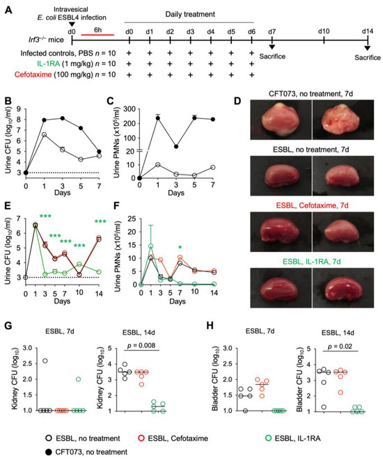 Efficacy of IL-1RA treatment on kidney infection in Irf3−/− mice infected with an ESBL isolate. Irf3−/− mice were infected with the ESBL4 E. coli isolate (108 CFU, n = 10 mice from 1 experiment, 5 mice per time point) and treated according to the protocol shown in Figure 1A with IL-1RA (anakinra, 1 mg/kg, n = 10 mice) or cefotaxime (100 mg/kg n = 10 mice) daily for seven days. PBS was used in the control mice. (A) Schematic of the treatment protocol. (B,C) Comparison of mice infected with the uropathogenic strains CFT073 and ESBL4. (D) Therapeutic efficacy of IL-1RA defined by a loss of gross kidney pathology, hyperemia, and edema. No treatment effect was seen in cefotaxime-treated mice. (E) Kinetics of infection. Accelerated bacterial clearance in IL-1RA- but not cefotaxime-treated mice. Mean log10 CFU/mL urine is shown for days 1, 3, 5, 7, 10, and 14 post-infection. (F) Kinetics of neutrophil recruitment. Mean neutrophil numbers in urine are shown for days 1, 3, 5, 7, 10, and 14 post-infection. Neutrophil recruitment was inhibited by IL-1RA but not cefotaxime treatment. (G) Quantification of bacteria in whole kidney tissue (days 7 and 14). (H) Quantification of bacteria in whole bladder tissue (days 7 and 14). Data are presented as individual mice, and the horizontal lines represent the median (G,H) and mean ± SEM (B,C,E,F). Data were analyzed using the Kruskal–Wallis test, * = p < 0.05, *** = p < 0.001.