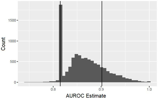 Histogram of bootstrapped area under the receiver operating characteristic curve (AUROC) estimates.