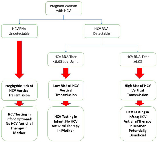 Overall, the vertical transmission rate of HCV is approximately 5.8% (95% confidence interval (CI) = 4.2–7.8%) [8]. Previous studies identified risk factors increasing the chance of transmission, including coinfection with the human immunodeficiency virus (HIV), which increases the rate of vertical transmission by 2 to 4 fold [9,10,11]. Additionally, the finding of a high HCV RNA titer in previous studies was associated with an increased risk of HCV vertical transmission [10,11,12]. Cesarean section was previously thought to be protective of HCV vertical transmission; however, recent studies were either unable to find significant differences in transmission rates between vaginal and Cesarean delivery or were unclear as to the role of operative delivery regarding a means of protection [10,13,14].
