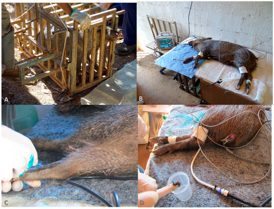 For the experimental procedure, the 24 collared peccaries were submitted to an eight-hour fast, with ad libitum access to water. The capture and physical–chemical restraints were carried out as proposed by Silva and collaborators [17]. Capture was carried out by moving the animals to a fixed chute and then to a containment cage. Chemical restraint was conducted using a combination of midazolam (0.41 mg/kg) and butorphanol (0.31 mg/kg) plus detomidine (157 μg/kg) (Figure 1).