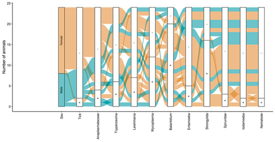 Alluvial diagram showing the distribution of epidemiological characteristics and parasitism in the 24 peccaries analyzed in this study. The + symbol indicates presence, and the - symbol absence. The color blue indicates male, and the color brown indicates female P. tajacu.