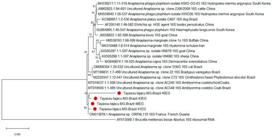 Phylogenetic trees were constructed using the partial 16S rRNA gene nucleotide sequences for Anaplasma spp. obtained in this study and those selected from GenBank. Nucleotide sequences were aligned with MUSCLE from the MEGA X package [43]. Following alignment, sequences were evaluated to determine the best DNA models for molecular analysis using the MEGA X package. For Anaplasma spp. sequences, each alignment was analyzed using the maximum composite likelihood method (ML) with the Tamura 3-parameter model and the neighbor-joining method (NJ) with the Kimura 2-parameter method. Internal branch confidence was assessed using the bootstrapping method with 1000 replicates. The nucleotide sequences amplified for this parasite in whole blood were deposited in GenBank under the following accession number: PP051538-PP051539.