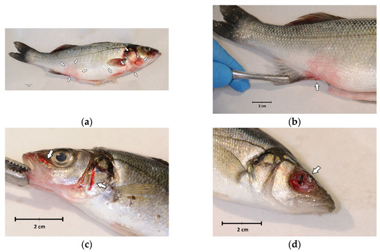 External examination of sea bass (Dicentrarchus labrax) involved in the outbreak of lactococcosis caused by Lactococcus garvieae: (a) External aspect of a sea bass with L. garvieae septicaemia characterised by diffuse skin and fin redness (arrows); (b) reddish area on the side, near the pelvic fin; (c) haemorrhages of the head (arrows); (d) ulceration and eye loss.