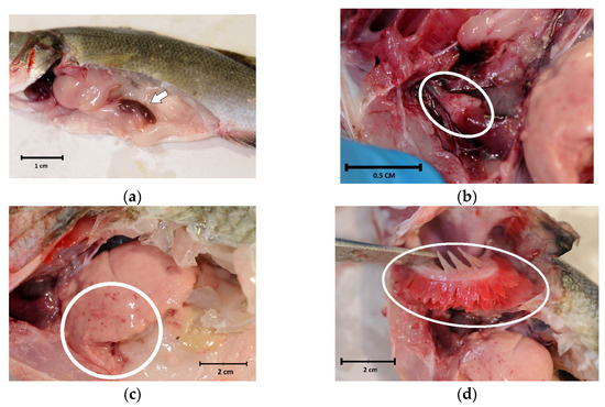 Internal examination of sea bass (Dicentrarchus labrax) involved in the outbreak of lactococcosis caused by Lactococcus garvieae: (a) paleness and splenomegaly (arrow); (b) pericarditis and cardiac haemorrhages (oval); (c) liver haemorrhages (circle); (d) paleness of the gills (oval).