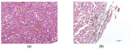 Histological images (haematoxylin–eosin stain, 20× magnification) of the sea basses (Dicentrarchus labrax) involved in the outbreak of lactococcosis caused by Lactococcus garvieae: (a) spleen. In the spleen, hyperplasia of the melanomacrophage centres (examples marked with arrows) associated with severe and diffuse white pulp depletion was observed; (b) heart. In the heart, multifocal fibrinous (examples marked with ovals) pericarditis with haemorrhages (examples marked with arrows) was observed.