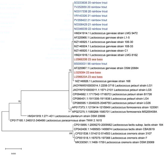 Since many authors reported that an analysis of the 16s rDNA gene is not able to discriminate between L. petauri and L. garvieae [32,33,34,35], the 16S-23S ITS region sequence was extracted from the obtained contigs and aligned with sequences of Lactococcus spp. retrieved from Genbank (accession numbers of L. garvieae: HM241914, AF225968, AF225967, MZ146926, MZ146925, MZ146924, MZ146920 and HM241916; L. petauri: JAOYNW010000014, JAOYNY010000011, CP094882, CP086401 and CP086595; L. formosensis: AP017373 and AP027275; L. plantarum: HM241919; L. paracarnosus: CP017195; L. lactis: CP015895 and CP042408; and L. cremoris: CP031538, CP051518 and MK330561). Evolutionary analyses were conducted in MEGA X using the Maximum Likelihood method and Tamura–Nei model [36,37], with a bootstrap of 1000, obtaining the tree reported in Figure 4.