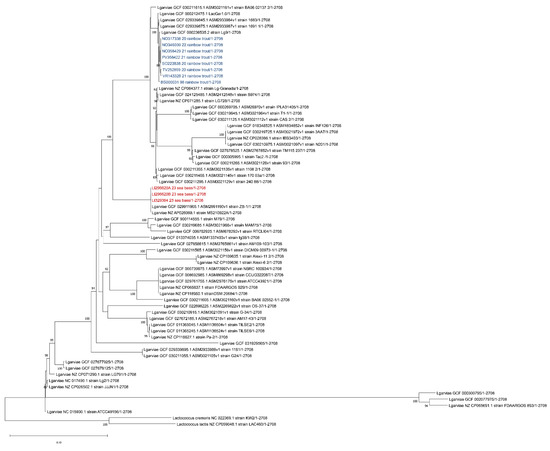 SNP tree resulting from a CSI-Phylogeny tool. Strains isolated from sea bass (Dicentrarchus labrax) described in this manuscript are highlighted in red while the isolates from previous outbreaks that occurred in Italy in rainbow trout (Oncorhynchus mykiss) are highlighted in blue. Lactococcus lactis strain LAC460/1 and Lactococcus cremoris strain KW2/1 were used as the outgroups.