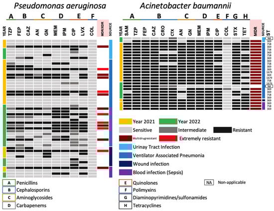 Heat map of the antimicrobial resistance profiles of the Gram-negative ESKAPE bacteria non-lactose fermenting by isolation source and year (2021 and 2022). (left) Pseudomonas aeruginosa and (right) Acinetobacter baumannii strains.