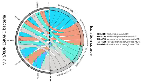 The antimicrobial resistance profile was determined through the guidelines established by CLSI (2022) [], and the classification of MDR (multidrug-resistant), XDR (extensively drug-resistant), and PDR (pandrug-resistant) Gram-negative ESKAPE bacteria was conducted according to “Latin American consensus to define, categorize and notify multidrug-resistant pathogens, with widespread resistance or pan-resistant pathogens” []. Pseudomonas aeruginosa ATCC 27853 and E. coli ATCC 25922 were used as controls. Results were inferred as susceptible, intermediate, or resistant by measuring the diameter of the inhibition zone. The frequency of antibiotic resistance was calculated and represented in percentages (%), and MDR, XDR, and PDR classification was performed through heat maps. The visualization of the distribution of MDR and XDR phenotypes of Gram-negative ESKAPE isolates and isolate sources was analyzed using ShinyCircos software (https://github.com/venyao/shinyCircos (accessed on 17 October 2023)) according to Yu et al. (2018) [].
