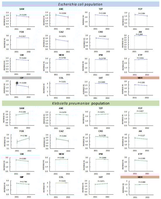 ANOVA analysis and Tukey’s test for the identification of changes in the resistant phenotypes of the group of Enterobacterales of Gram-negative ESKAPE bacteria. Escherichia coli and Klebsiella pneumoniae population. Antimicrobial abbreviations: SAM, ampicillin/sulbactam; AMC, amoxicillin/Ac. clavulanic; TZP, piperacillin/tazobactam; FEP, cefepime; FOX, cefoxitin; CAZ, ceftazidime; CRO, ceftriaxone; AN, amikacin; GM, gentamicin; MEM, meropenem; IPM, imipenem; ETP, ertapenem; CIP, ciprofloxacin; COL, colistin; STX, trimethoprim/sulfamethoxazole. * Significant difference (p = 0.05).
