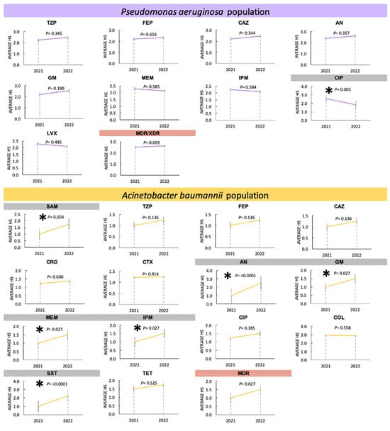 ANOVA analysis and Tukey’s test for the identification of changes in the resistant phenotypes of the group of Enterobacterales of Gram-negative ESKAPE bacteria. Pseudomonas aeruginosa and Acinetobacter baumannii population. Antimicrobial abbreviations: SAM, ampicillin/sulbactam; TZP, piperacillin/tazobactam; FEP, cefepime; CAZ, ceftazidime; CRO, ceftriaxone; CTX, cefotaxime; AN, amikacin; GM, gentamicin; MEM, meropenem; IPM, imipenem; CIP, ciprofloxacin; LVX, levofloxacin; COL, colistin; STX, trimethoprim/sulfamethoxazole. * Significant difference (p = 0.05).
