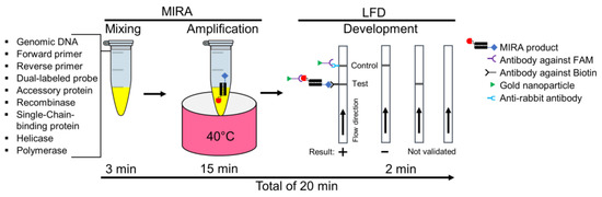 The schematic and workflow of MIRA-LFD for detecting tlh, tdh, and trh genes of Vibrio parahaemolyticus. This assay consists of three steps—mixing, amplification, and development—all completed within 20 min. During the MIRA procedure, the amplicon is labeled with FAM and biotin through the reaction of primers, probe, accessory protein, recombinase, single-chain binding protein, helicase, and recombinase. The LFD has both a test line that reacts with the biotin of the amplicon and a control line containing an anti-rabbit antibody that reacts with an antibody conjugated with a gold nanoparticle.