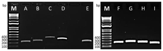 Validation of primers for the amplification of tlh (A–D), tdh (E), and trh (F–I) genes using basic RPA. (A) VP_TLH_F1 and R1 (226 bp), (B) VP_TLH_F1 and R1-2 (256 bp), (C) VP_TLH_F2 and R2 (369 bp), (D) VP_TLH_F2 and R2-2 (312 bp), (E) VP_TDH_F1 and R1 (238 bp), (F) VP_TRH-F1 and R1 (243 bp), (G) VP_TRH-F1 and R1-2 (266 bp), (H) VP_TRH-F2 and R2 (243 bp), and (I) VP_TRH-F2 and R2-2 (208 bp). “M” is an abbreviation for the molecular-weight size marker.