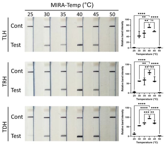 Optimization of temperature (from 25 °C to 50 °C) for tlh, trh, and tdh genes using MIRA. MIRA reactions were conducted for 15 min, and LFD assays were performed for 1.5 min. LFD strips exhibited an upper control line and a lower test line when the MIRA reaction was successfully accomplished. Data represent the means of three independent replicates (one-way ANOVA, ** p < 0.01, *** p < 0.001, and **** p < 0.0001).