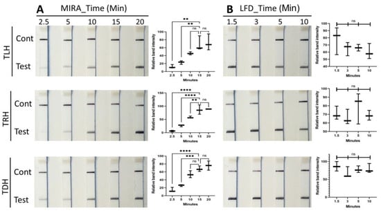 Optimization of MIRA and LFD incubation time for tlh, trh, and tdh genes. MIRA reactions (A) were conducted at 40 °C, and LFD assays (B) were performed at room temperature. LFD strips exhibited an upper control line and a lower test line when the MIRA reaction was successfully accomplished. Data represent the means of three independent replicates (one-way ANOVA, ** p < 0.01, *** p < 0.001, and **** p < 0.0001).