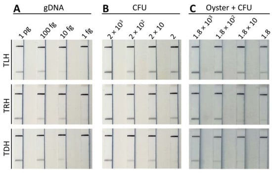 Evaluation of sensitivity of MIRA-LFD for the detection of tlh, trh, and tdh genes. The genomic DNA ((A) gDNA ranging from 1 pg to 1 fg), direct bacterial culture ((B) ranging from 2 × 103 to 2 CFU), and seeded oyster ((C) gDNA ranging from 1 pg to 1 fg) were subjected to the MIRA-LFD assay. LFD strips exhibited an upper control line and a lower test line when the MIRA reaction was successfully accomplished.