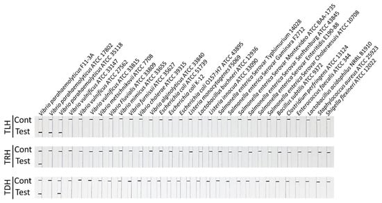 The specificity of MIRA-LFD for the tlh, tdh, and trh genes was determined using various bacteria listed in Table 1. As illustrated in Figure 7, the F11-3A strain exhibited positivity for all three genes. The 35118 strain showed positivity for the tlh and trh genes but tested negative for the tdh gene. In contrast, the 17802 strain exhibited positivity for the tlh gene but tested negative for the tdh and trh genes. All other Vibrio and foodborne pathogenic bacteria tested negative for all three genes. The results of the F11-3A, 35118, and 17802 strains regarding the tlh, tdh, and trh genes are consistent with previous studies [,]. Additionally, the PCR and qPCR assays exhibited concordant results for the three genes when compared with MIRA-LFD. Taken together with previous studies on MIRA-LFD, the current study indicates that MIRA-LFD is highly specific for target genes without cross-reactivity with other closely related bacteria [,,].