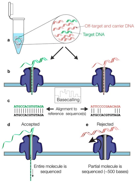 In experiments where a control flow cell was run in parallel, a variation in the protocol was performed at the final step, which consisted of using 24 µL of EB (elution buffer) from the kit itself to elute the library in order to obtain a sufficient volume to load the same library preparation onto two different flow cells to be sequenced in parallel. For each sample, prepared libraries were loaded onto two Nanopore R9.4.1 flow cells, one for AS and one for control sequencing, and both flow cells were run at the same time on a GridION X5 device (MinKNOW version 21.05.8) for 6–72 h. The output of AS sequencing consists of nanopore reads in a FASTQ format, accompanied by a csv file that lists the classification of each read made by the MinKNOW version of the ONT ReadUntil API (https://github.com/nanoporetech/read_until_api (accessed on 3 March 2023)) based on read matching to the user-provided reference sequence(s). The whole process consists of the following steps: (a) The initial 400–600 bases of a strand that translocates through a given pore (b) are used by the software (c) to classify the read as “enriched” (flagged as “stop receiving” by ONT’s ReadUntil software) if the read sequence matches the reference(s) sequence and the read is then further sequenced (d). (e) A read is rejected (“unblocked”) if its initial bases do not match the reference sequence(s) (Figure 1). A voltage inversion at the pore level expels the DNA molecule out of the pore and prevents its further sequencing.