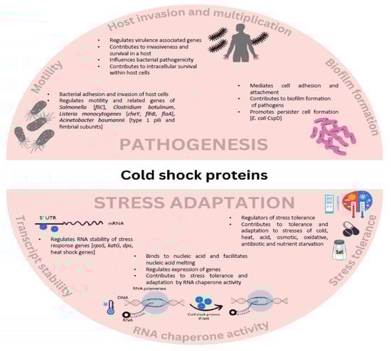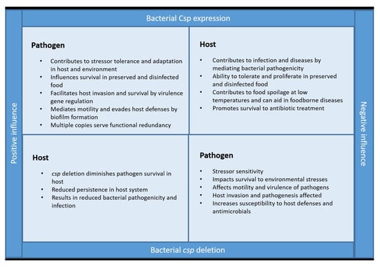 Csps are currently being looked at from the perspective of regulating virulence-associated genes and mediating pathogenesis within a host [31]. These stress adaptation proteins utilize their ability of stress endurance and offer an upper hand to bacteria in surviving hostile environments within a host. Therefore, Csps are emerging as potential regulatory players in processes concerning pathogenesis. In this review, we first explore how Csps influence genes associated with virulence and influence survival in a host. Next, we address their involvement in food contamination by impacting survival in response to preservation and disinfection strategies. We then, finally, address how these aspects could positively and negatively impact bacteria and the host and discuss future challenges.