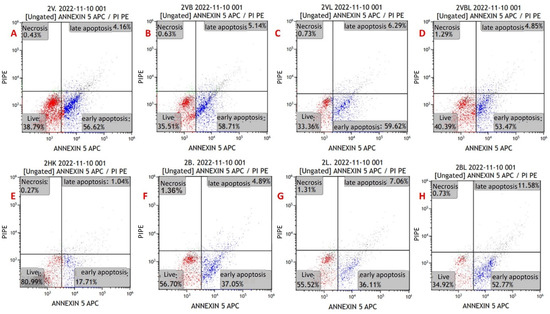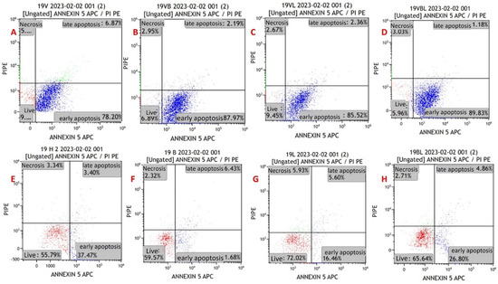 Apoptosis analysis according to cell surface phosphoserine exposure was performed using flow cytometry. All cell groups for each patient were prepared using 1–2 × 106 cells/mL and incubated for 48 h. The cells were stained with APC-Annexin V/PI (APC Annexin V Apoptosis Detection Kit with PI, BioLegend, San Diego, CA, USA) for 15 min at room temperature. After centrifugation, cell pellets were suspended in a buffer solution. All cells, apoptotic and necrotic, were analyzed with a flow cytometer (BD FACSCalibur, Franklin Lakes, NJ, USA).