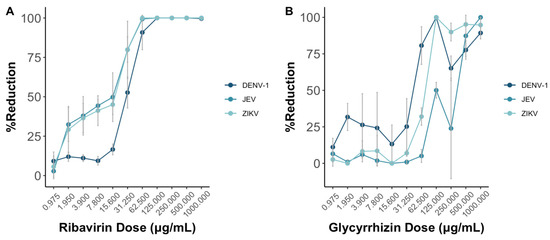 - Crance, J.M.; Scaramozzino, N.; Jouan, A.; Garin, D. Interferon, Ribavirin, 6-Azauridine and Glycyrrhizin: Antiviral Compounds Active against Pathogenic Flaviviruses. Antivir. Res. 2003, 58, 73–79. [Google Scholar] [CrossRef] [PubMed]